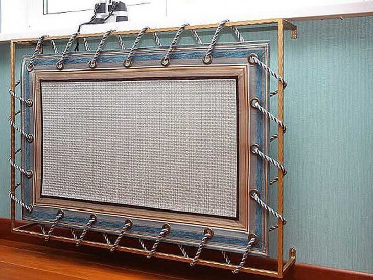Решетку для маскировки радиатора можно купить готовую, а можно сделать самостоятельно из картинного багета или дверных наличников, запиленных под углом в 45 градусов. Центр декоративной решетки можно сделать из негорючей ткани, ротанга или металлической сетки.