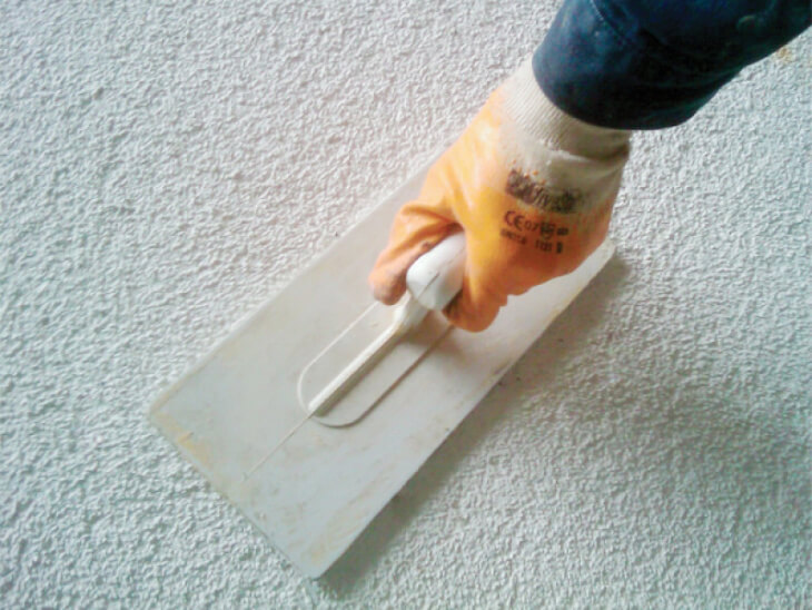 - Технология заключается в набрасывании штукатурного раствора на стены резкими движениями, после которого с помощью доски или мастерка смесь разравнивается на стене