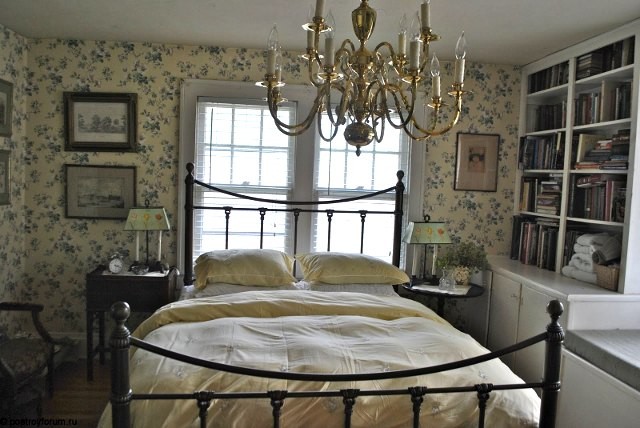 На матрас кладется толстая легкая пуховая перина, сверху все закрывается вязаным покрывалом, мягкими пледами, по которым разбросаны декоративные подушки разнообразных размеров и форм. Предпочтительные рисунки – “шотландка”, мелкие цветочные узоры. Окна украшаются пышными драпировками, они могут быть узорчатыми или вышитыми. В спальне допустимо сочетать дорогие ткани такие как бархат и дамаст с ситцем и льном – но в разумных количествах.