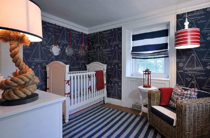 Все морские атрибуты уместны и в рисунке обоев, и в текстиле детской. Хороши часы или люстра, украшенные куском каната. Можно вместо торшера поставить светильник в виде уличного фонаря – как на набережной.