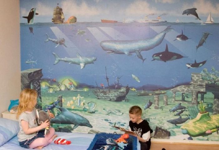 Однотонные обои в комнате – не лучшее решение, даже если вы задумали погрузить ребенка в таинственное подводное царство. Дело в том, что неудачно выбранный оттенок может дать кардинально противоположный эффект. Например, светло-голубой тон визуально увеличивает пространство комнаты, но стоит всего лишь приблизиться к синему цвету, как получится угрюмое замкнутое пространство. Оптимальным вариантом будет являться сочетание цветов, причем не только близких по оттенку, но и контрастных.