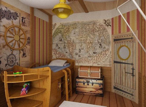 Если же имеется такая возможность, то можно слегка украсить имеющиеся мебельные конструкции, например, задекорировав их под пиратский корабль. Например, у детской кровати разместить в изголовье флаг или паруса. Боковую стену, к которой примыкает кровать, стилизовать под корабельные мачты, а внешнюю часть спального места – под борт, ну а с торца закрепить настоящий штурвал.