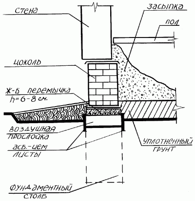 Рисунок 2. Схема фундамента с теплым подпольем и кирпичным цоколем.