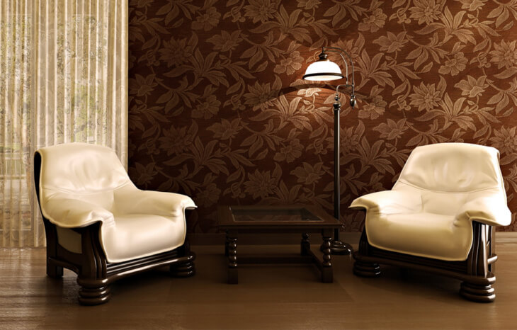 Кабинет лучше украсить обоями с крупным орнаментом. Дело в том, что он отлично сочетается с деревянной массивной мебелью. А именно такая мебель преимущественно и украшает кабинеты.