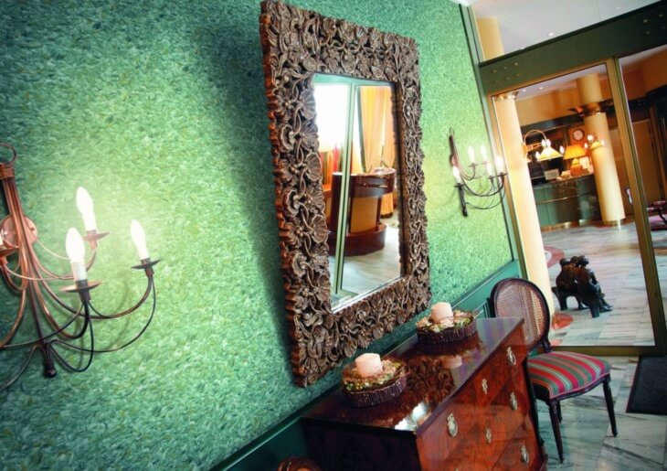 Покрытие с декоративным стекловолоконным слоем можно подобрать для части стен в комнате. Сложное переплетение нитей создает оригинальные 3D узоры. Низкая паропроницаемость препятствует естественной вентиляции. Желательно использовать фрагментарно в качестве дополнительного декора.