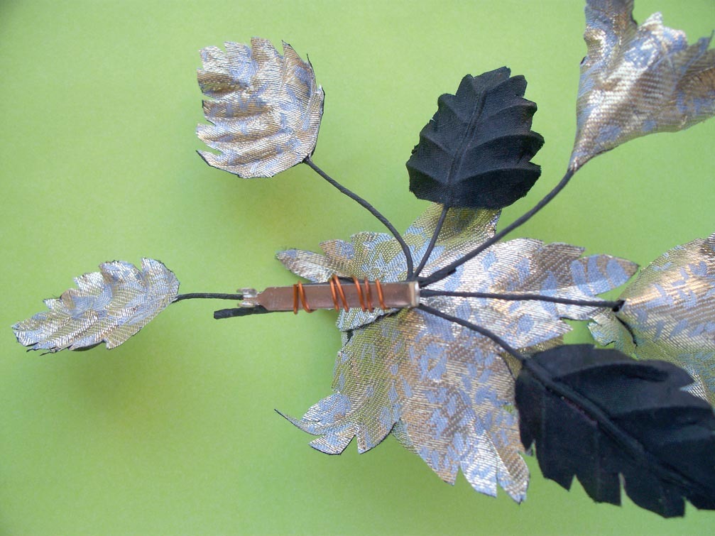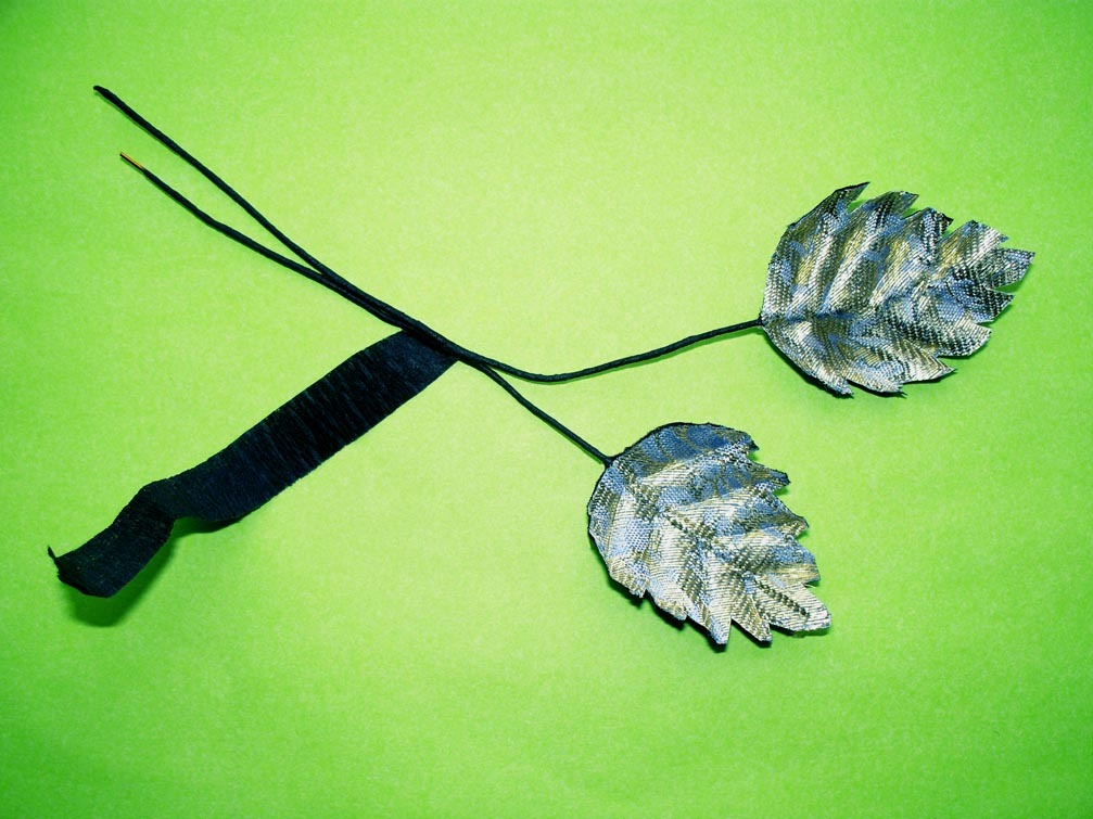 Стебли с розочками и листочки собирают в композицию, обматывая совместно несколько(оптимально 2-3) проволочек бумагой, периодически подмазывая ПВА. Для удобства можно использовать пинцет. Далее добавляют другие проволочки-стебельки. При срезании лишней длины у стебельков не следует обрезать все проволочки на одном уровне, должна быть разница в длине 2-3 мм, в противном случае на стеблях получатся резкие перепады толщины. |