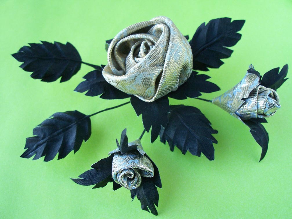 Если разобраться в технике скручивания самого простого изделия — розы из ленточных полосок, в дальнейшем можно браться за более сложные творения. Чтобы получить розы разных размеров, бутоны, раскрывшиеся головки, надо варьировать размерными особенностями подобранной ленты. Состав использованной ленты подбирается по творческому пожеланию изготовителя.