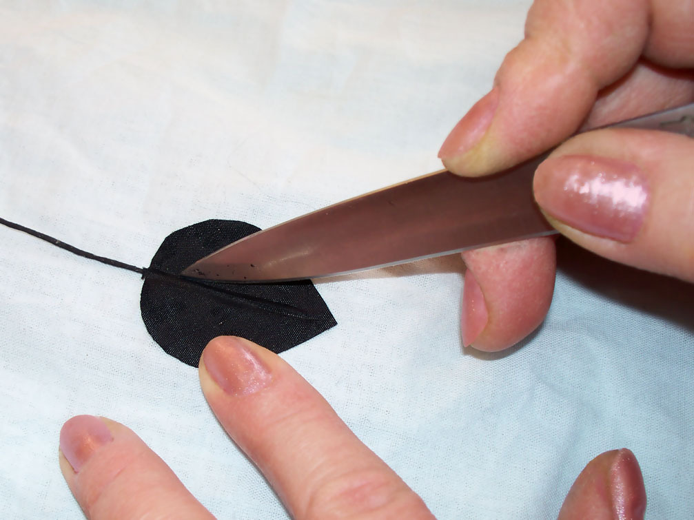 Прожилки на листике делаем на покрытой тканью полужесткой подушке, нажимая с усилием ножом по изнаночной стороне листика. Можно дополнительно пройтись таким же способом по лицевой стороне между уже сделанными по изнанке прожилками. |