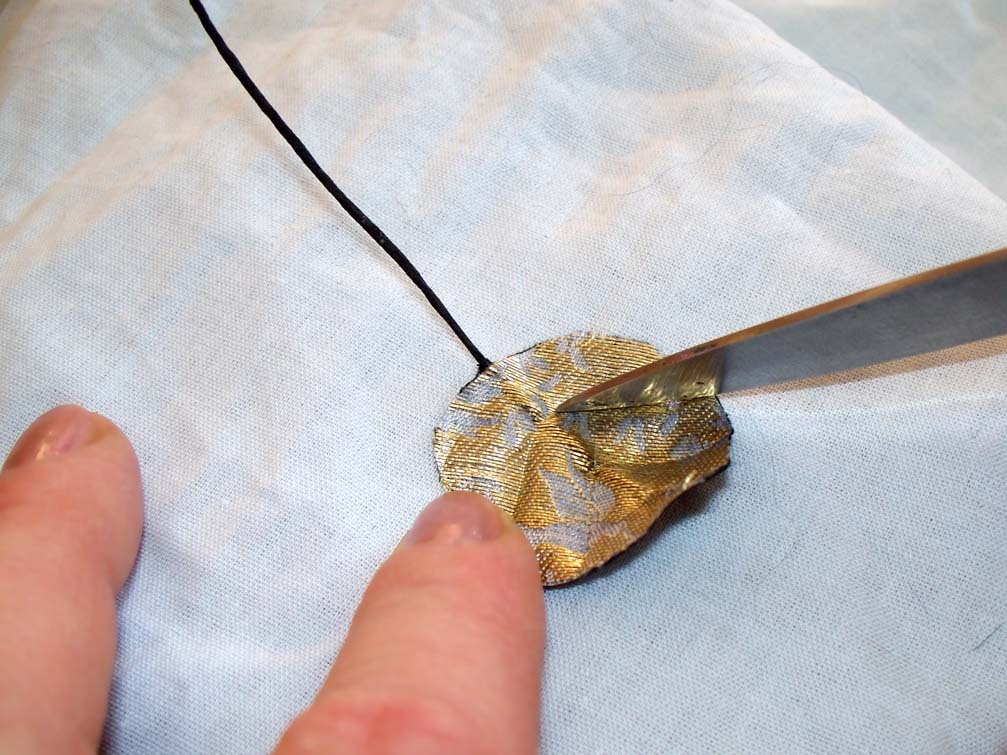 - Для того, чтобы прикрыть изнаночную сторону изделия, вырезать небольшой круг из плотного картона, приложить его на кусочек ткани, завернув внутрь края, закрепить клеем.