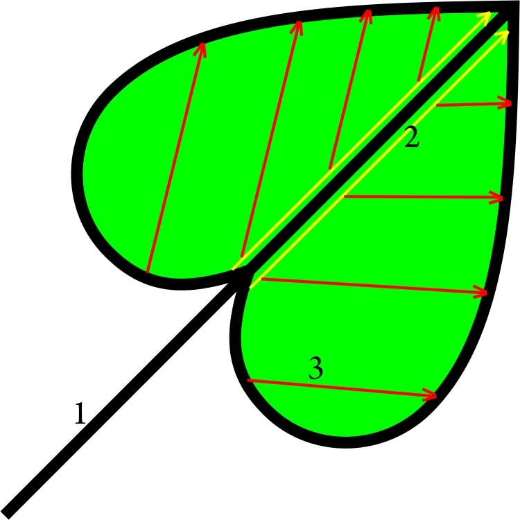 Схема раскладки и обработки. На схеме цифрами помечено: 1-Стебелёк-проволочка; 2-Провести с усилием горячим ножом по направлению стрелок по лицевой стороне. 3- Провести с усилием по направлению стрелок по изнаночной стороне. |