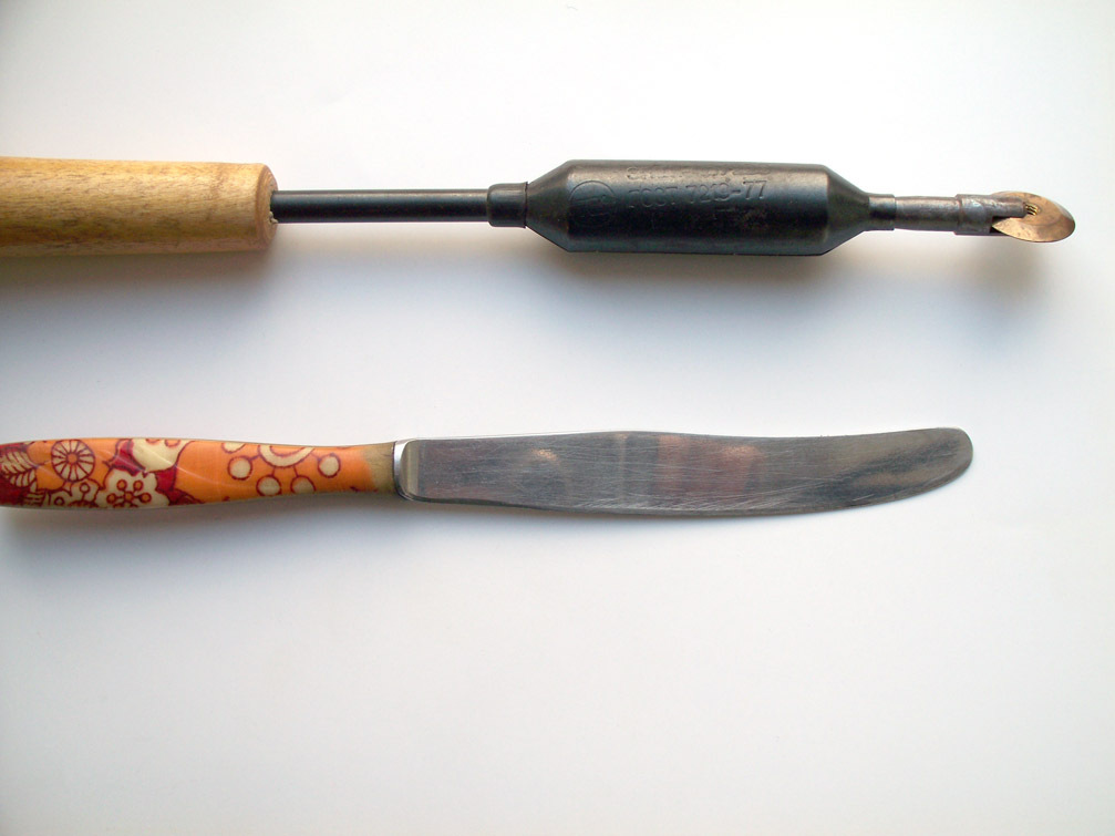 Современные профессиональные инструменты для цветов представляют из себя насадки на паяльник.) Обработка двойным ножом заменяется двумя проходами одинарным ножом. Профессиональный одинарный нож, в свою очередь, можно заменить обычным столовым ножом. Его желательно чуть подогревать на кухонной плите. Впрочем, формовку на ПВА можно выполнить и холодным ножом. На фото показан вариант профессионального одинарного ножа на паяльнике и его адекватная замена.