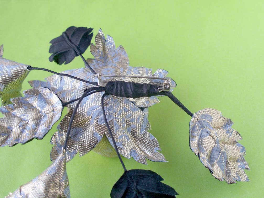 Чтобы розочку можно было носить, к ней прикрепляют фурнитуру (застёжку для брошек, заколку –автомат, шпильку или гребень дли волос). Обычно фурнитуру сначала приматывают проволокой (без бумаги), далее дополнительно обматывают бумагой место крепления.