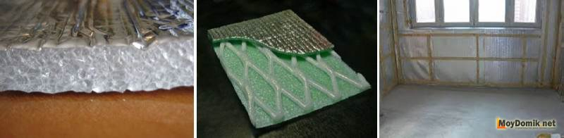 Фольгированные утеплители препятствуют выходу тепла из комнаты за счет отражающей поверхности. Служат не как основной теплоизолятор, а как дополнение к основному виду утеплителя.