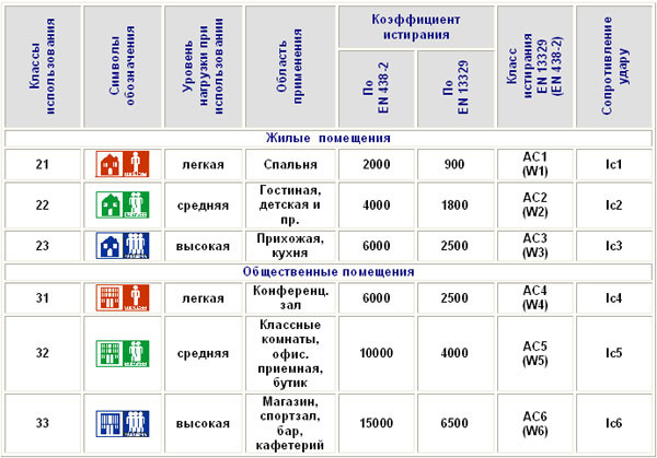 Класс истираемости определяет, где именно можно использовать ламинат. Более точная информация приведена в таблице ниже.