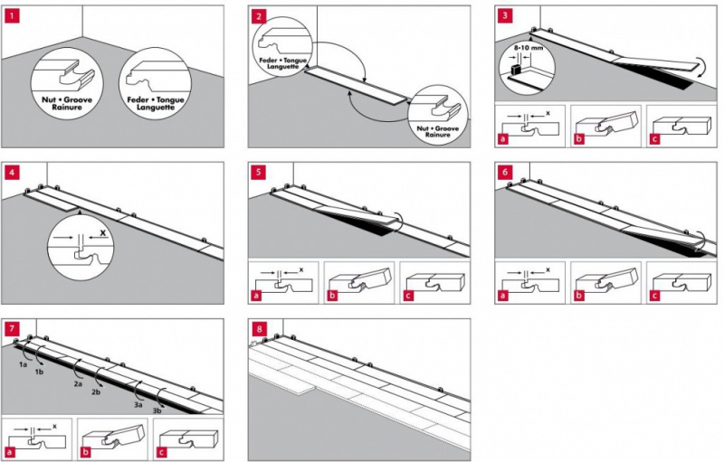 Бесклеевые панели могут оснащаться двумя видами замков — Lock и Click. Наиболее простым в монтаже считается первый вариант. Одна сторона такой доски имеет паз, а на другой присутствует выступающий шип. Соединение панелей осуществляется при помощи деревянного молотка. Кликовые замки прочнее. С монтажом таких панелей справится даже непрофессионал. Доски попросту вставляются одна в другую под углом в 45 градусов и без особых усилий защелкиваются.