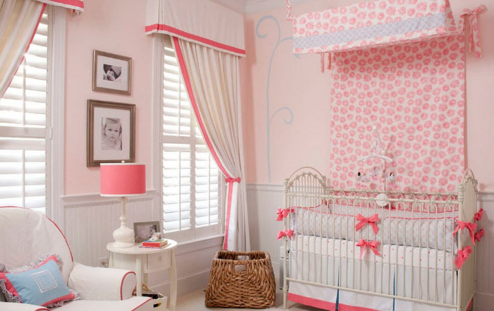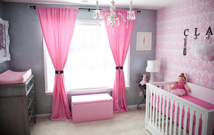 Детская для новорожденной девочки оформляется натуральными и легкими тканями. Рекомендуются ткани с нежными рисунками: ангелочками, зайчиками и мишками. Расцветки лучше использовать пастельных оттенков: персиковых, ванильных или молочных. В зависимости от характера ребенка выбирается цветовое решение. Для спокойной малышки можно подобрать яркие тона, а для непоседливого ребенка стоит использовать оттенки зеленого, желтого и серого.