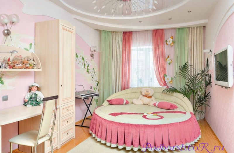 Для декора можно использовать драпировки, крупные принты и завязки на шторах. В своей комнате девочка должна чувствовать себя как принцесса.