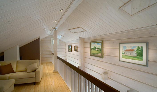 Одним из самых популярных материалов для отделки второго этажа деревянного дома является гипсокартон. Его можно применять для потолка, стен. С его помощью легко и просто скрываются дефекты строительства и прячутся коммуникации. Если нужно сделать перегородки, лучшего сырья вы не найдете. Но, отделка деревянного дома гипсокартоном применяется исключительно в помещениях с нормальной влажностью. Конечно, на нашем рынке сейчас есть материалы, которые считаются влагостойкими. И всё равно, для отделки ванной комнаты в деревянном доме, лучше использовать другую разновидность.