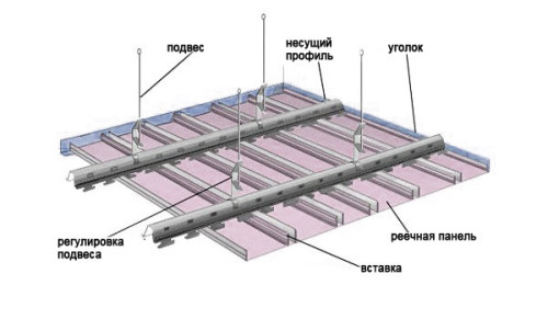 Модульные элементы реечной потолочной системы представлены длинными и сравнительно узкими металлическими или пластиковыми панелями или рейками. Стыкование всех элементов осуществляется посредством специальных, одинаково загнутых краев.