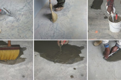 - Швы и трещины заделываются ремонтной смесью. В обязательном порядке расстилаются гидроизоляционные материалы. Если заливка производится на старое покрытие в достаточно хорошем состоянии, то шаг с гидроизоляцией можно пропустить.