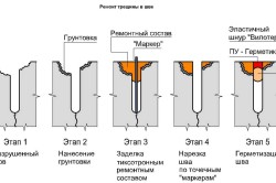- Трещина заполняется тиксотропным составом, использование самодельных смесей в подобных случаях не рекомендуется