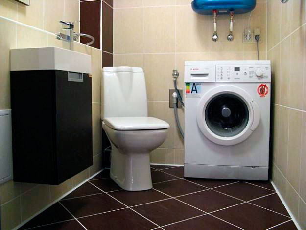 Для экономии места созданы миниатюрные стиральные машинки,которые называются «флоп». Они позволяют сэкономить не только пространство, но и воду за счет интегрированного сливного бачка. Подиум для машинки можно сделать и своими руками; если установить её на уровне глаз, то будет проще загружать белье в стирку.
