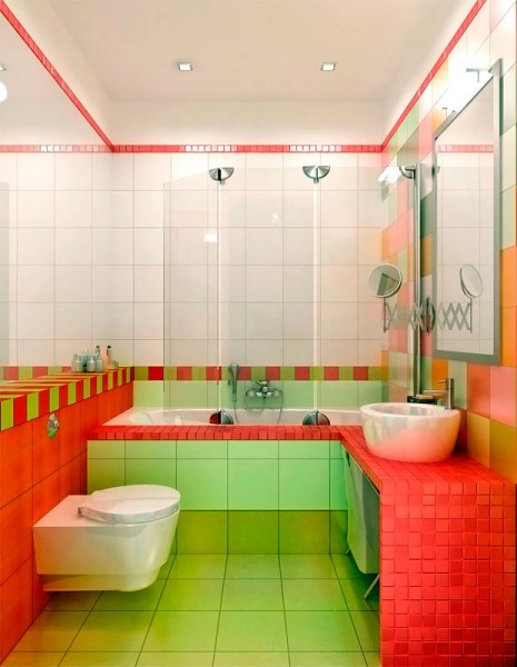 Использование 2-3 сочных «тропических» цветов. Например: оранжевый, зеленый, желтый. В таком интерьере у вас всегда будет хорошее настроение, яркие фруктовые оттенки будут вносить позитив в вашу жизнь и делать комнату светлее. Если вы боитесь использовать такие цвета при отделке спальни и гостиной, то в ванной комнате это можно себе позволить.