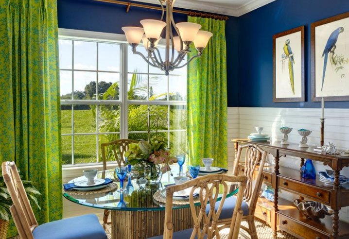 Для создания интерьера «синей комнаты» подбирают обои и краску синего цвета, шторы и текстиль выбирают в нужном синем оттенке, но с узором. Такой ход добавляет живости обстановке. Шторы гармонично вписываются в пространство, не выделяясь на общем фоне.