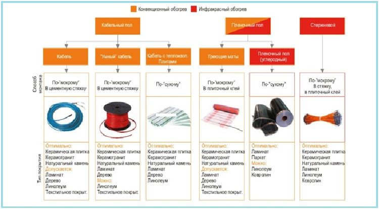 Схема разновидностей электрических тёплых полов.