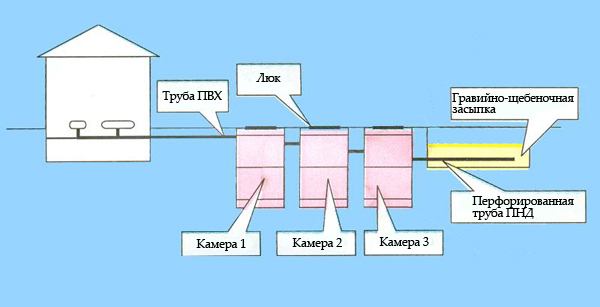 На фото схема установки септика из трех камер с почвенной доочисткой стоков на фильтрационном поле