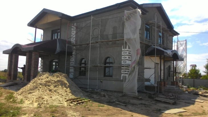- Оштукатуренные поверхности желательно защитить от грязи и пыли. Если пыль осядет на поверхность стен до того, как штукатурка затвердеет, внешний вид дома пострадает.