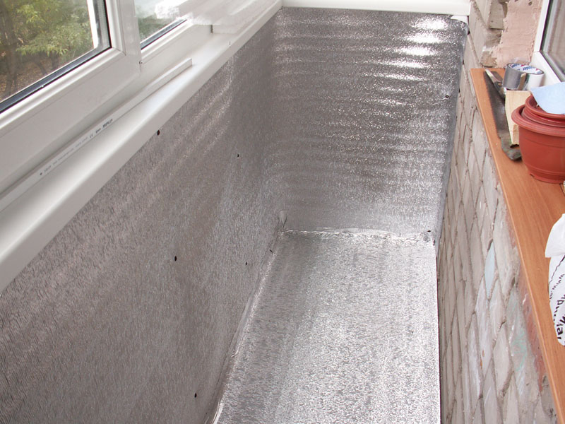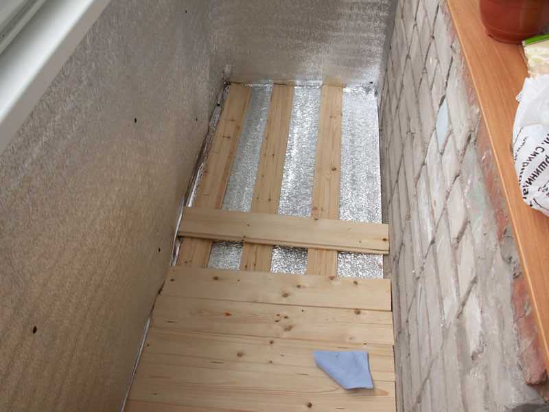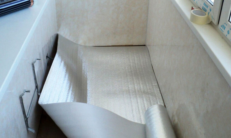 Чаще всего применяется пенофол, двухслойный утеплитель: вспененный полиэтилен, плюс слой алюминиевой фольги. Утеплитель удобен в использовании, если нельзя сильно увеличивать толщину конструкции покрытия на балконе. Правильно укладывать этот материал фольгой вверх, используя ее свойство отражать тепло внутрь балкона, что экономит часть энергии. Слой из фольги обеспечивает дополнительную паро- и гидроизоляцию.