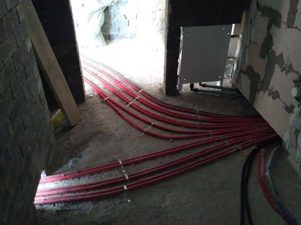2) укрытие труб отопления и водоснабжения, разведенных по полу (на фото — объект до выполнения стяжки);