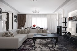 Цветовая гамма светлая, может быть черно-белой, поэтому даже плотные занавеси из бархата не утяжеляют интерьер комнаты.
