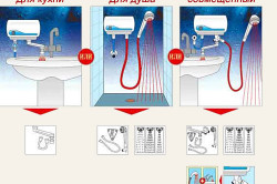 Если душ и мойка находятся рядом через стену, возможен монтаж одного изделия, далеко друг от друга – придется купить два маломощных устройства или один более мощный напорный водонагреватель.
