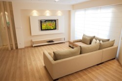 - Высота от пола должна быть не меньше 1.3-1.5 м. Чем выше установят телевизор, тем сильнее будут уставать глаза, поскольку придется постоянно смотреть вверх, а это лишнее усилие. Рядом с телевизором располагают блок розеток, отступив 25 см от кронштейна, на который устанавливается техника. Расстояние до зрителя составляет несколько метров: оно должно равняться 2-3-кратному размеру диагонали.