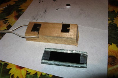 - На деревянном бруске закрепите металлические контакты и припаяйте к ним концы электрических проводов с вилкой. Установите стекла на брусок – отопительный прибор готов.