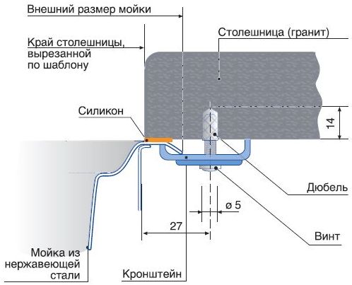 Конструкцию протирают влажной тряпкой, чтобы убрать весь силикон. Если же в наличии имеется накладная мойка, то крепление может осуществляться при помощи уголков, которые крепятся кронштейнами. При этом 4 пластины в порядке очереди фиксируются шурупами изнутри. Шурупы закручиваются примерно на 5-6 мм.
