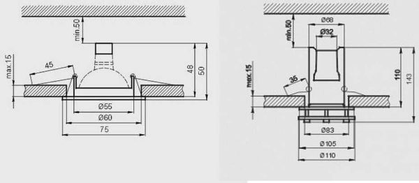 | Глубина врезного отверстия. | Точечные светильники со встроенной лампой тоньше, чем обычные. Это позволяет сократить потери высоты при использовании натяжных или подвесных потолков. Глубина врезки светильников 3-5 см. | Большинство точечных светильников со сменной лампой требуют расстояние между подвесным и несущим потолком от 6 до 7 см. |