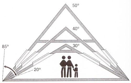 Использование подкрышного пространства требует наличия высокого потолка, поэтому, если в доме будет мансарда, крышу нужно максимально поднять. Это можно сделать за счет увеличения наклона или же выбора определенного типа крыши, о чем речь пойдет ниже. Оптимальным для мансардной крыши является уклон в 38-45 градусов. При более крутом наклоне значительно увеличиться расход материалов, что тянет за собой необоснованный перерасход.