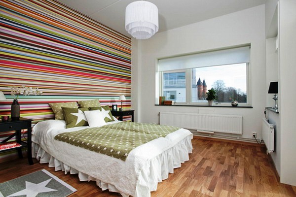 При этом, ярким покрытием стоит украсить узкую сторону в центре комнаты, особенно если к ней приставлена кровать. Расширить площадь поможет текстура в горизонтальную полоску.