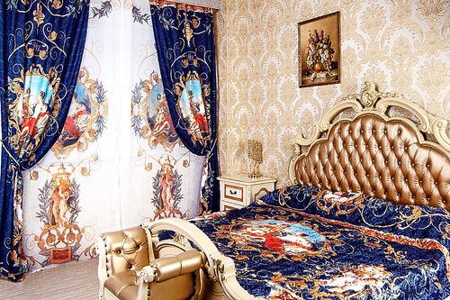 Модель «Ампир» из габардиновой ткани, заслужила лучшие отзывы у покупателей. Гардины производятся в насыщенном шоколадно-бордовом цвете, декорированные богатым узором в восточном стиле. Такое оформление позволяет надежно затенить помещение, создавая отличную преграду для солнечных лучей.