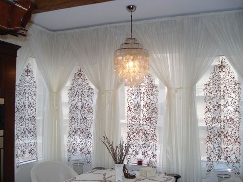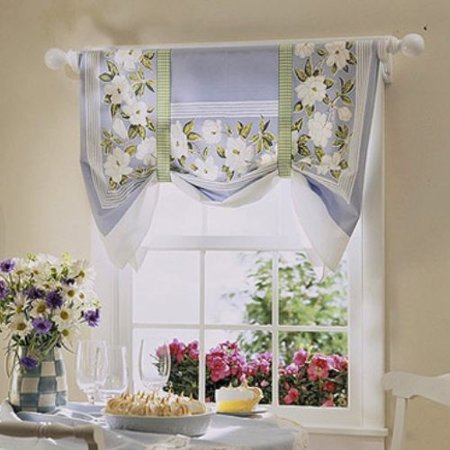 Вуаль, органза и жаккард позволят мастерице выполнить роскошные романтически и барочные композиции. Не стоит только забывать, что кухня – это рабочее помещение и слишком роскошные узоры здесь будут неуместны.