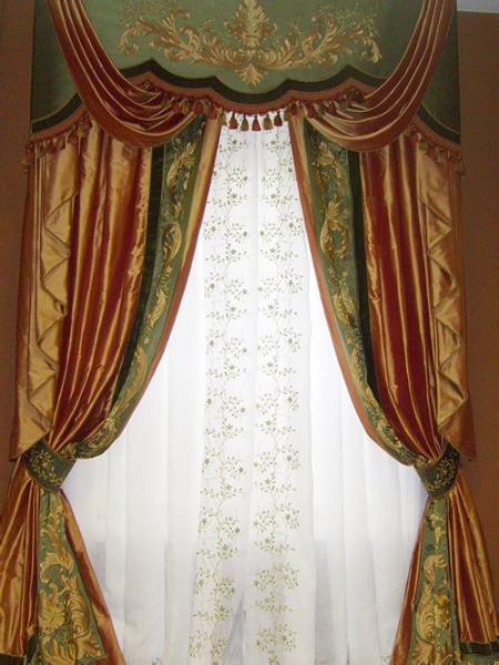 Романские интерьеры, ампир или эклектика потребуют выразительных оригинальных тканей, украшенных серебряной или золотой вышивкой и высоким купоном на нижней кромке шторы.