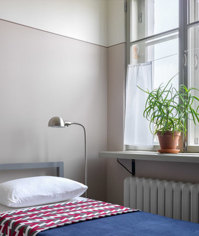 На фото — отличный пример стилизации советского авангарда, интерьерного стиля 20-х годов. Это реконструкция, в расчете на туристов и краткосрочную аренду. Используйте укороченные занавески над подоконником, только если сознательно добиваетесь похожего эффекта