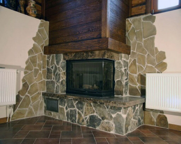 Такой материал изготавливают на основе цемента с добавлением керамзита, крошки, гипса. Заливка отражает форму природных камней. Стоимость изделий ниже натуральных, вес намного меньше, обрабатывать легче. Добавки красителей позволяют изготовить камни десятков оттенков. Отделка камина этим элементом проста, не требует специальных навыков. В отличие от природного камня, легко подрезать по месту укладки.