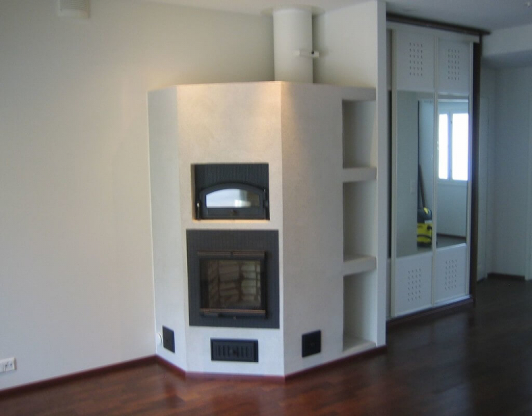 Печка и камин отделаны штукатуркой с элементами дерева и кирпича