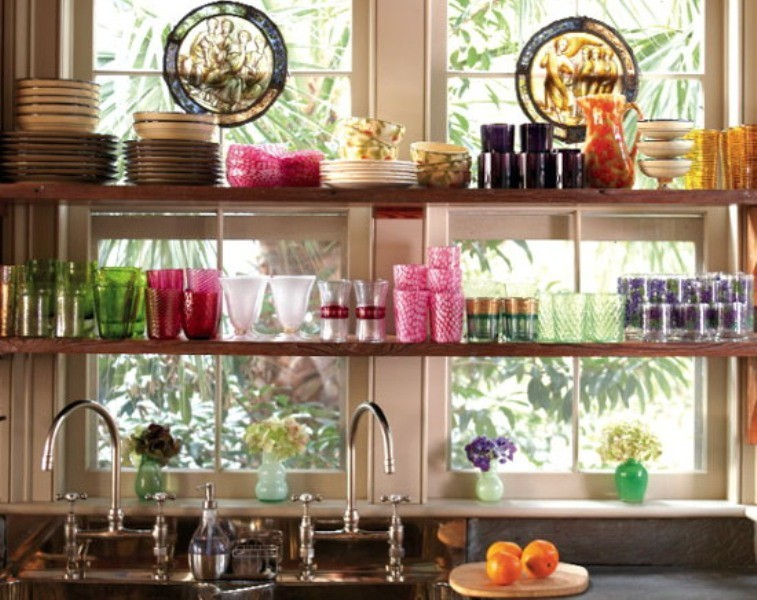 Посуду можно хранить не только в закрытых шкафах, но и на узких открытых полках. Пусть любимый сервиз станет оригинальным декором кухни!