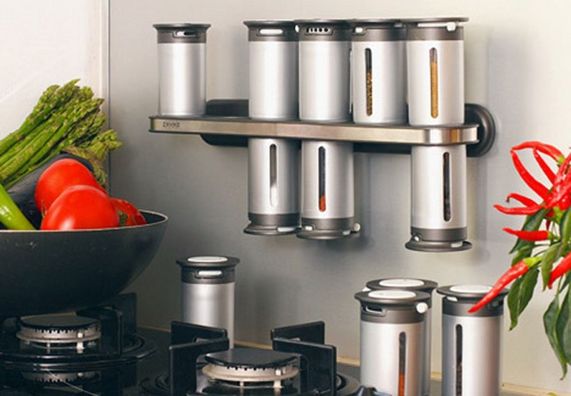 - Жестянки с пряностями удобно хранить на магнитах. Специальную магнитную планку можно прикрепить к холодильнику или внутренней дверце шкафа.