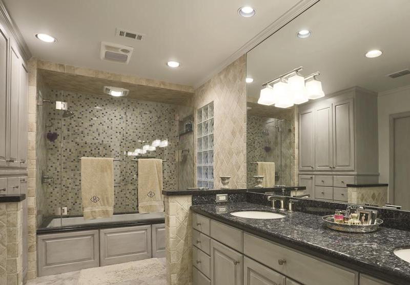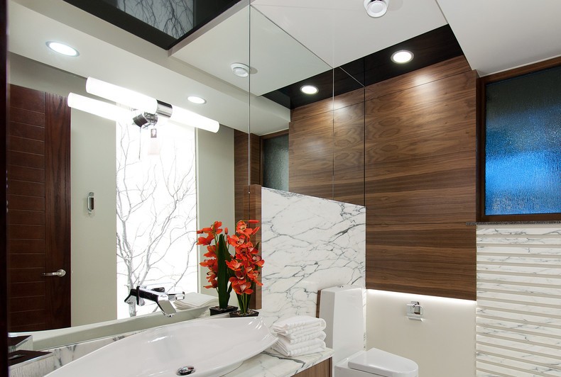 Освещение в ванной комнате должно быть комбинированным, с возможность выключения ненужных светильников. Например, при нанесении макияжа или бритье требуется дополнительная подсветка зеркала, а при принятии ванной нужен светильник в этой зоне.